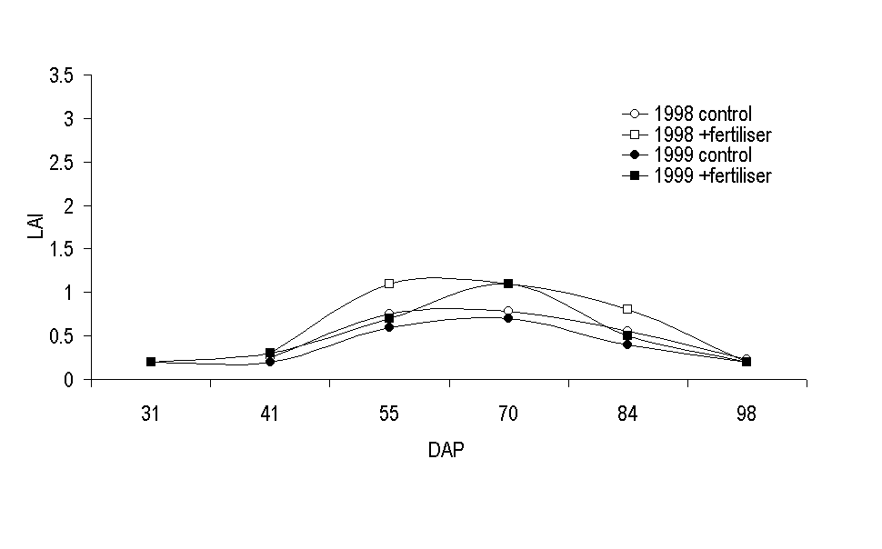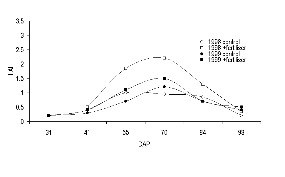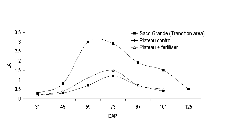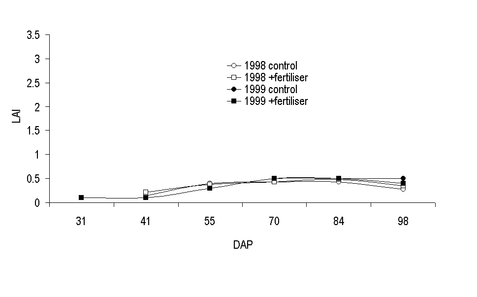 A preliminary evaluation of the 1998/99 data indicated almost no or only small differences between fertilised and unfertilised treatments although water availability was much less limited in this growth period (see Annex, Figures 1 to 3). It is, therefore, considered that soil fertility plays a much more important role in limiting crop growth on the plateau sites than expected before. This observation also corresponds with the LAI performance of the less-demanding cowpea on the plateau sites. Cowpea, either sole or intercropped, did not show a better LAI development in the second year. Fertiliser applications only produced a small increase of the cowpea LAI, whereas almost no effects were observed for maize. Although the test site had not been used for crop production for a couple of years, soil fertility was already strongly reduced within two cropping seasons. Apparently, the supplied fertiliser dose was not sufficient to raise the yields of maize and cowpea. These findings have to be checked with the data of the subgroup Plant Nutrition where fertiliser was applied at a higher level. These data, however, will be available for the coming reporting period.